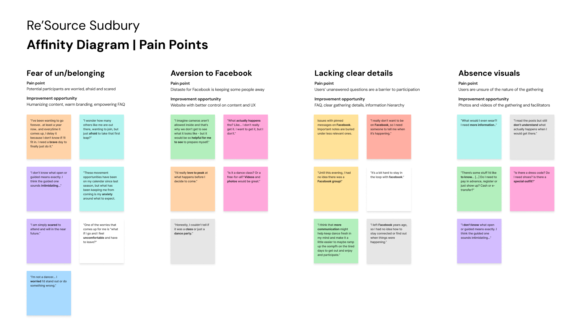 From this, 4 key pain points emerged: the fear of un/belonging, aversion to Facebook, lack of clear details and absence of visuals to help newcomers imagine the experience.