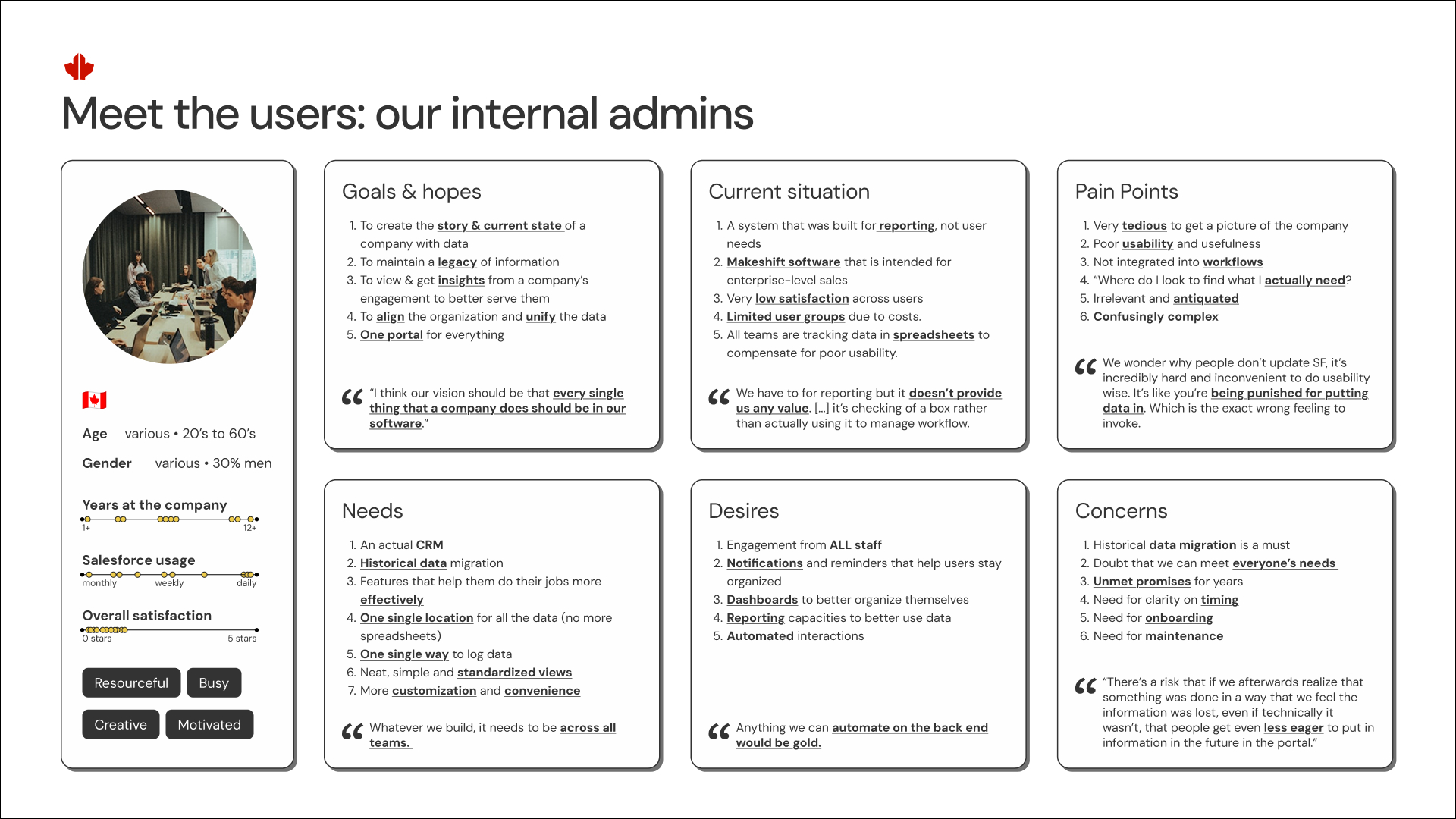 I led a research sprint of usability testing, contextual inquiry and stakeholder interviews across departments (Client Services, Data & IT, Program teams & Executives). Admins needs, behaviours and contexts revealed design priorities.
